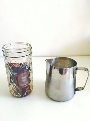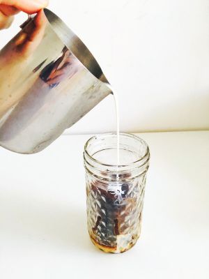 开始缓慢的把奶冲入放咖啡冰的杯子