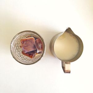 把咖啡冰放入杯子,一袋牛奶放入奶缸