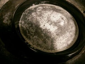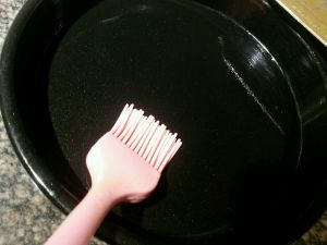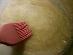 这时烧一锅水,用平底的碟子或烤盘筛层麻油或熟油,就是加热过的油,用刷子轻刷一层,要蒲蒲的