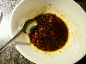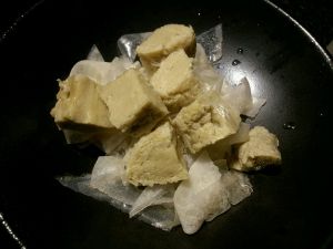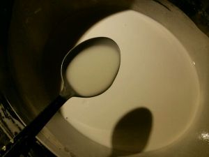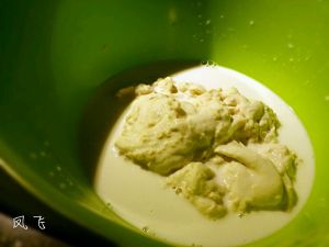 沉淀过后的浆用大勺轻轻将上面的水挖出,一定要轻,别将下面的浆破坏掉,剩下的用勺子拌匀