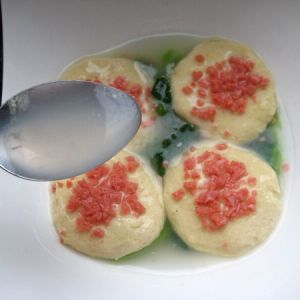 将拌好的豆腐泥挤成丸子,然后用手按扁,放入盘中,上面撒上火腿末,上锅蒸5分钟定型