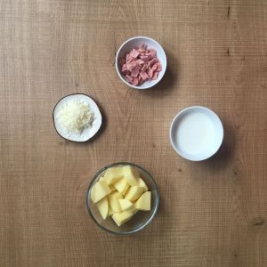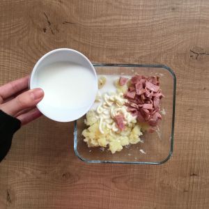将培根拌入土豆泥,加入少许色拉酱和适量牛奶拌匀,