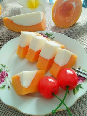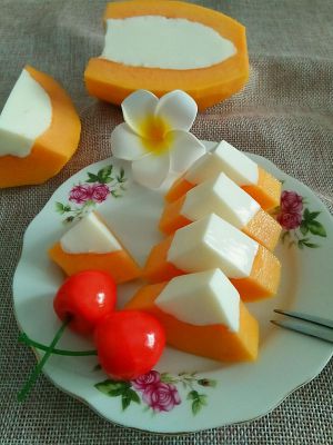 木瓜4分之1处切开,把里面的籽掏干净,5克吉利丁片提前用凉水泡软,泡软后倒掉凉水,隔热水融化后倒入牛奶和白糖,搅拌均匀后又倒进木瓜里就好了,放冷藏三个小时后拿出来切十字刀就可以啦!