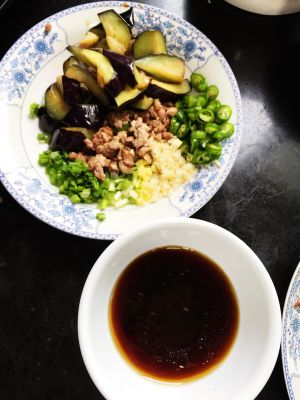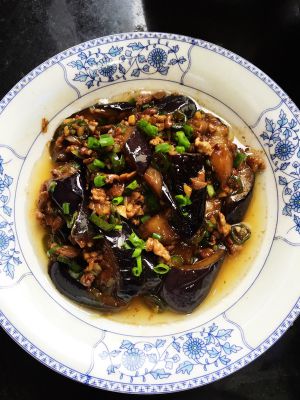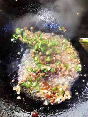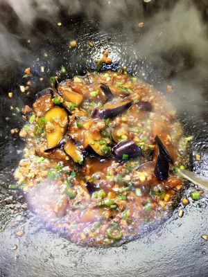 炸茄子的油倒掉、留一点点底油,放肉末炒至变色放葱姜蒜末、辣椒(这一步小火慢慢煸香),煸香后放一勺黄豆酱