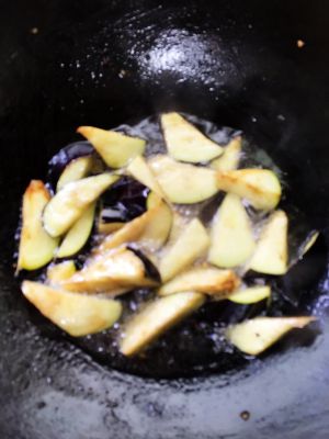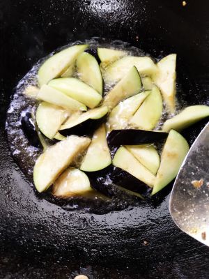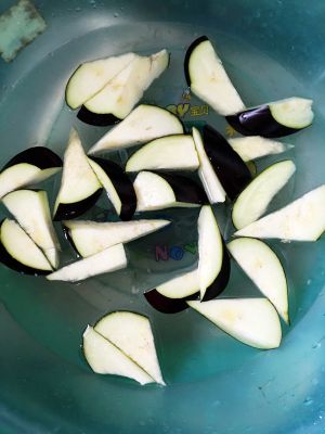 茄子切滚刀或长条,在盐水中浸泡5-8分钟