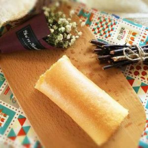 将奶油抹在蛋糕上,起始端和两侧涂满,起始端涂厚一点,收尾偏薄,尾部3厘米不涂,接擀面杖卷起。这个忘记拍了…