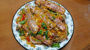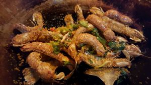 倒入炸好的皮皮虾,撒椒盐,喷点生抽,炒匀