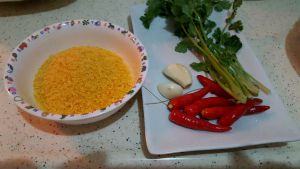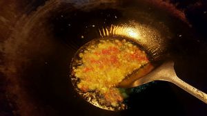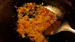 先炸蒜蓉姜丝辣椒圈,再倒面包糠翻炒