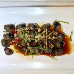 螺蛳装盘,把蒜蓉、小葱、剁辣椒均匀铺在螺丝上,淋上生抽。