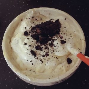 所有材料混合后加入了奥利奥碎,拌匀后覆盖保鲜膜放入冷冻,中途不用搅拌也可以,期待吧!