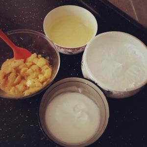 1.芒果切碎粒加了点柠檬汁,2.蛋白加糖打发,3.奶油加白糖朗姆酒打法,4.蛋黄加入牛奶和炼乳(加了一点玉米淀粉)微波炉加热70--80度,搅拌至浓稠,放至常温。