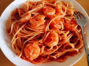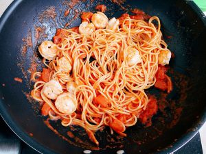 将意面和虾仁倒回锅中,翻炒1分钟左右即可出锅。