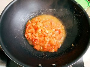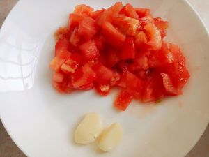 番茄顶部滑十字放入开水中煮去皮切丁,大蒜微微拍一下。
