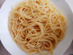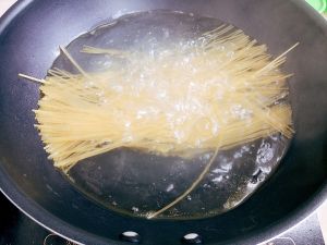 意面煮好后捞出,加入橄榄油拌匀防止面条互相粘连。