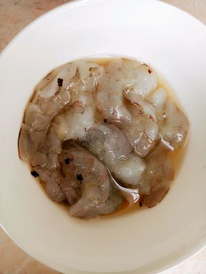 虾买回来后,摘掉虾头,剥壳取出虾仁,开背用牙签剔除虾线,洗净后加入盐黑胡椒料酒腌15分钟左右。