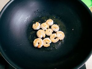 锅中倒橄榄油,放入腌好的虾仁煎到变红盛出备用,不要煎太久,否则肉质会变老。