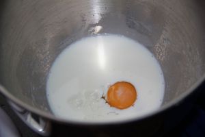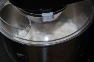 把酵母放中间,糖霜沿着盆边放入,用厨师机低速和面20分钟,大约10分钟左右时候加入黄油。