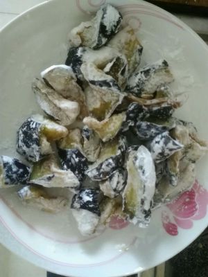 长茄子切成滚刀块,用盐唦20分钟,唦出水后,攥干水份,撒上干淀粉