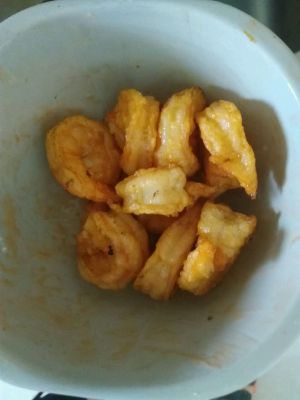 捞出茄块后,把虾仁放入炸制金黄后,捞出