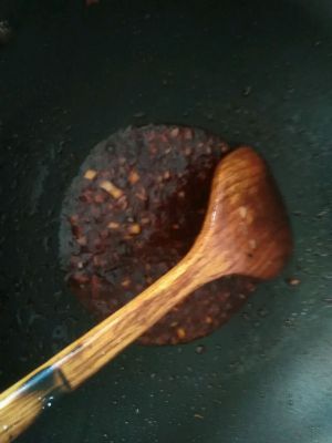 窄油烧热后,下入葱沫煸香,下入一勺郫县豆瓣酱,一勺番茄酱,煸香出红油后,10ml水,加半勺生抽,半勺糖,半勺白醋(由于加了糖,所以烧开后汤汁不用勾芡,就浓稠了)