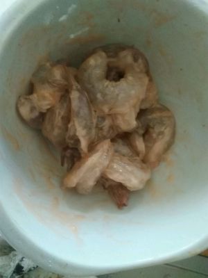 虾仁,挑虾线后,加适量盐,少量蛋清,淀粉抓匀