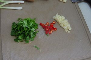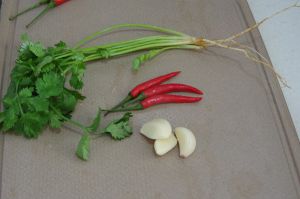 准备爽口木耳必备的配料,香菜,蒜,小米椒。