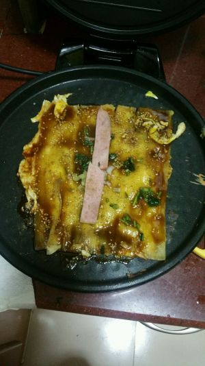 翻面刷酱,甜面酱和蒜蓉辣酱1:1.5再兑一倍的水,糖,醋依个人口味适量添加,葱花,香菜,孜然,芝麻,辣椒面,火腿,依次添加,利用余温把糖醋熬化。