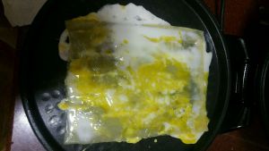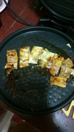 电饼铛热了后少许油,把冷面放上去,点一点水。