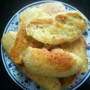 鸡蛋液加一点点盐打散,白馒头切片在鸡蛋液里滚一下均匀沾满。