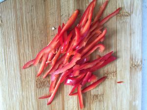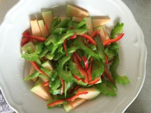 将哈密瓜放入拌好的苦瓜丝和辣椒丝中,混合摆盘。