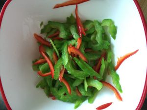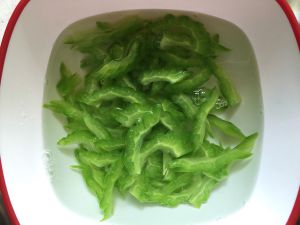 苦瓜去瓤切丝,在煮开的盐水中过水,时间要短,变色即出水,浸入凉开水中。