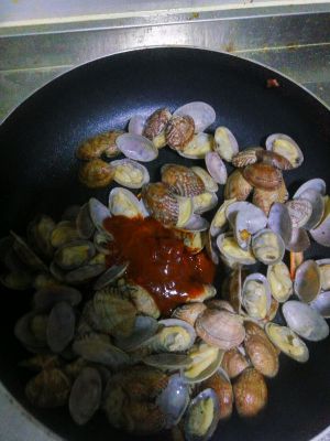 放入煮熟的花蛤。