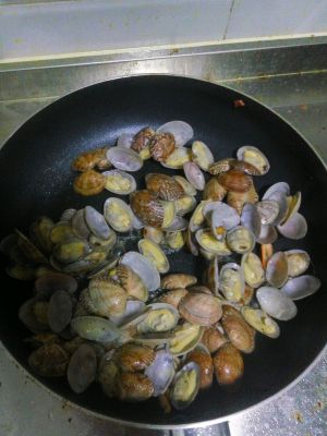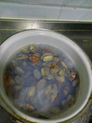 将买来的花蛤泡一会,之后呢,将其煮熟。水中放一点点盐。