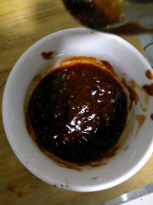 一勺蒜蓉辣酱,一勺甜面酱,一勺豆瓣酱,混合均匀,加入一点点水。