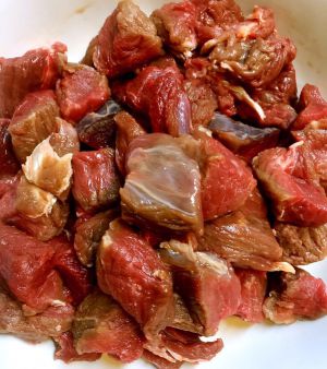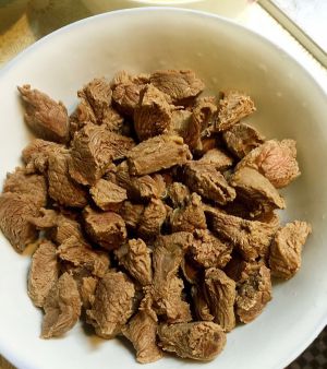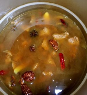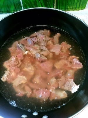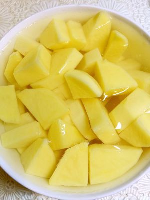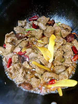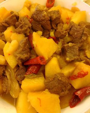将炒好的牛肉放入高压锅,加热水适量,闷20分钟,开锅放土豆块再闷5分钟