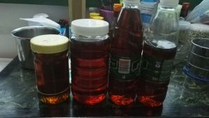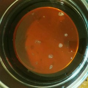 熬好的糖浆,放凉后会比熬的时候还浓稠一点,所以熬到琥珀色就可以了,用勺子撇去浮沫,凉了装入晾干的玻璃瓶里。放置一天后就可以用了,但是放久点更香浓,糖浆有很强的防腐蚀,做多了放到明年做月饼时也是可以用的