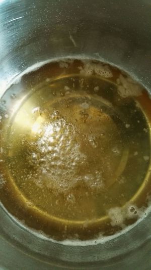 糖水煮开后倒入柠檬汁,这时候就不要搅拌了,再次煮开后,开小火熬煮,溅到锅壁上的糖浆,用刷子沾水沿着锅壁刷一圈~糖浆会流下去,不然糖浆会结晶。熬煮大概一个小时左右~如果有温度计的话,大概113℃~115的样子,糖浆呈琥珀色就可以了。