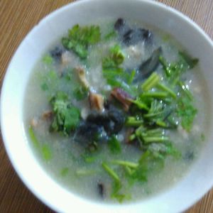 把瘦肉剁成肉末,香菇切丁,皮蛋切大块,葱,芹菜,香菜,切末,姜切丝,备用