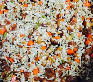 将菜末和腊肉末一起放入泡了一个晚上的糯米中,糯米要把水控干。
