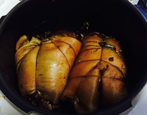 将捆住的肘子放入高压锅中,打到豆类和炖肉档即可。