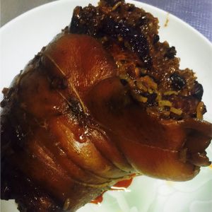 将腌制好的肘子从宽处塞入糯米馅并塞满。