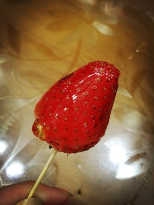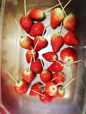 拿起草莓迅速在糖浆中转一圈,然后插在泡沫上放凉凝固,这个时候操作要小心,别让糖浆滴在手上,会很痛的,温度高啊!我不会告诉你我别烫伤了一下
