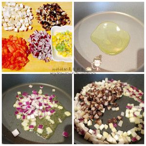 杏鲍菇、自制腊肠,洋葱、番茄去皮全部切成小粒,甜玉米豌豆备用;