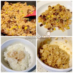 米饭留出小半碗用来做小熊的头,其他的倒入锅中翻炒;