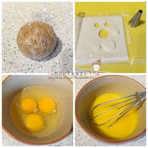 用合适的模具刻出小熊的眼睛和嘴巴以及被子上的花朵,用海苔剪出合适的形状做眼睛和嘴巴(忘记拍照了);