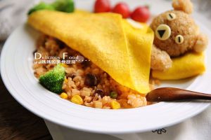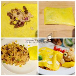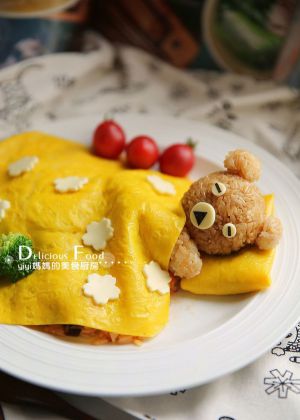 剩下的蛋液同样做成蛋饼,取一勺炒饭包在里面做成小熊的枕头;