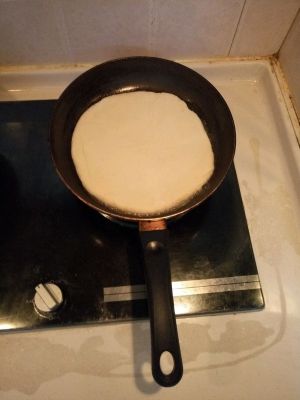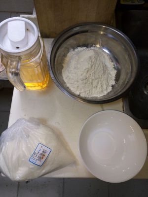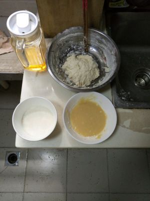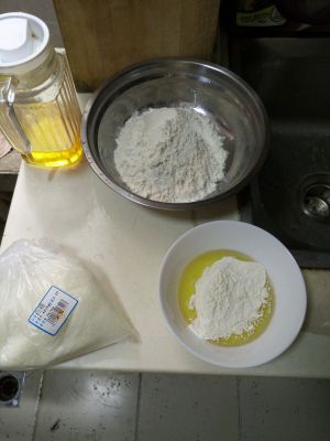 取一碗,碗里放少量食用油,再加面粉并搅拌均匀,准备做“馅”。