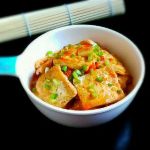 倒入豆腐、番茄酱、耗油和盐炖3分钟让豆腐入味。