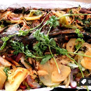 炒好菜倒鱼上再烤8分钟左右(洋葱可以不用炒)