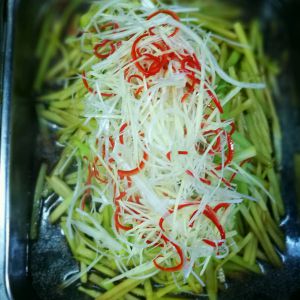 锅里放入味极鲜三勺,加少许水,放入盐味精少许白糖。烧开,把过好的芥兰丝摆好。味极鲜汁浇在上边。撒上刚才切的葱丝,红椒丝,姜丝。锅里烧热油浇上即可!